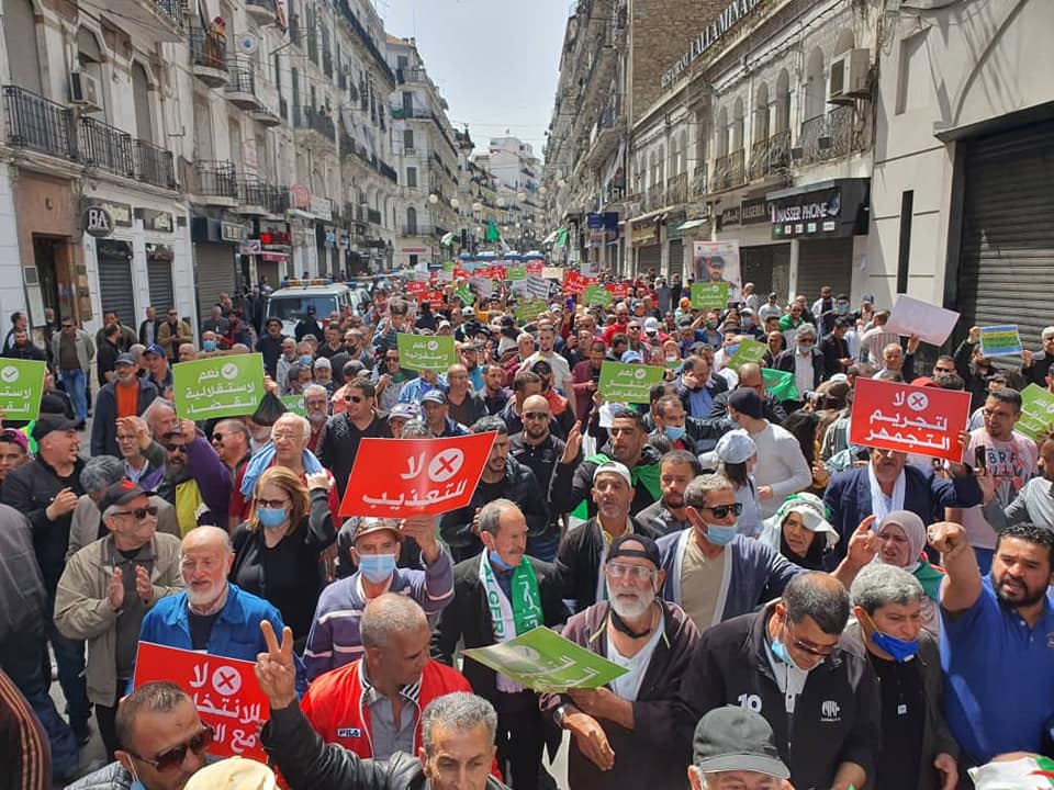 Le soutien au jeune de 15 ans, à Tadjadit et ses compagnons ainsi qu’aux 24 manifestants incarcérés en début de semaine et tous les détenus d’opinion n’a néanmoins pas éclipsé le thème central des manifestations de ce vendredi et des week-ends précédents : le rejet des élections législatives du 12 juin prochain, une des dernières étapes de la feuille de route que le pouvoir s’attèle à parachever unilatéralement.