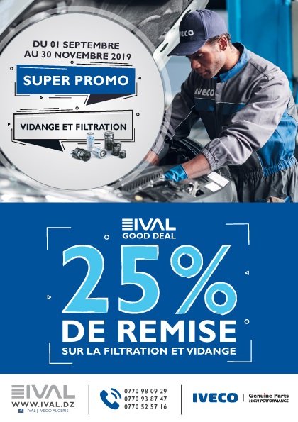 IVAL, représentant en Algérie de la marque IVECO, offre à sa clientèle une remise de 25 % sur la filtration et la Vidange. À travers son réseau du service après-vente, IVAL fait bénéficier ses partenaires du 01 Septembre au 30 Novembre 2019 d’une remise importante sur la vidange et la filtration d’origine 100% IVECO.