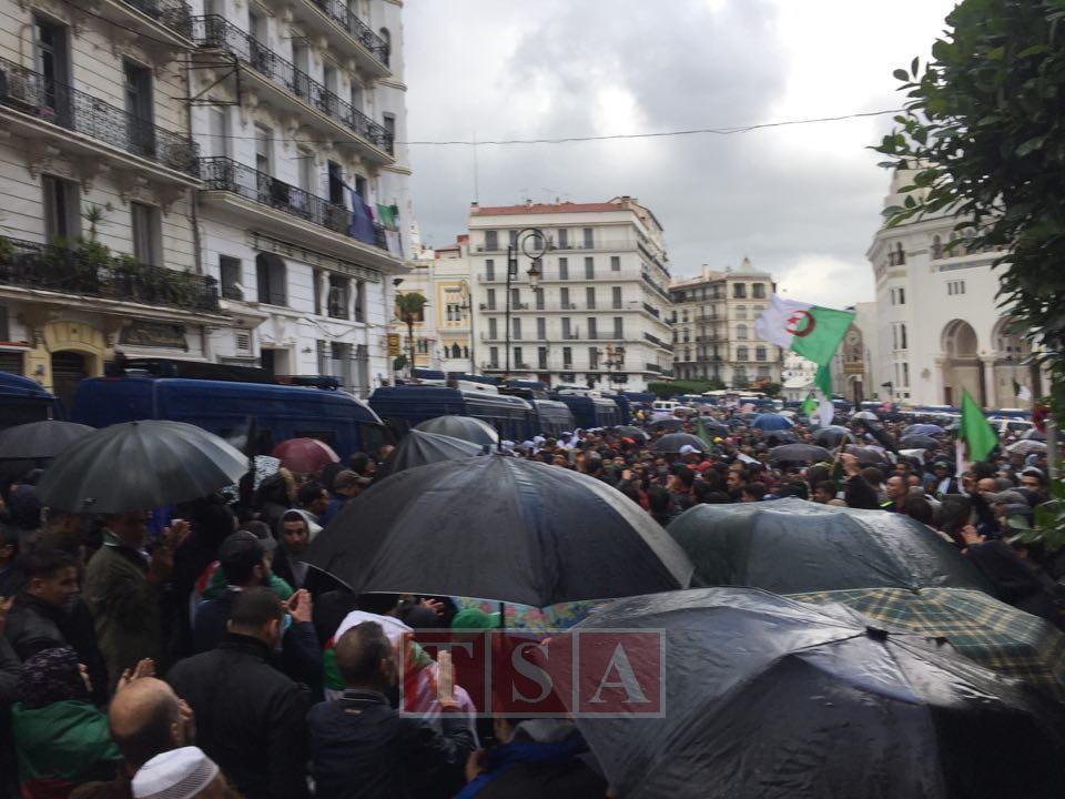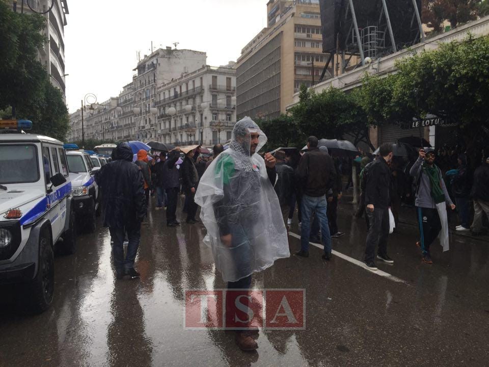 14h28. Alger : il pleut encore plus fort et les manifestants continuent de manifester.