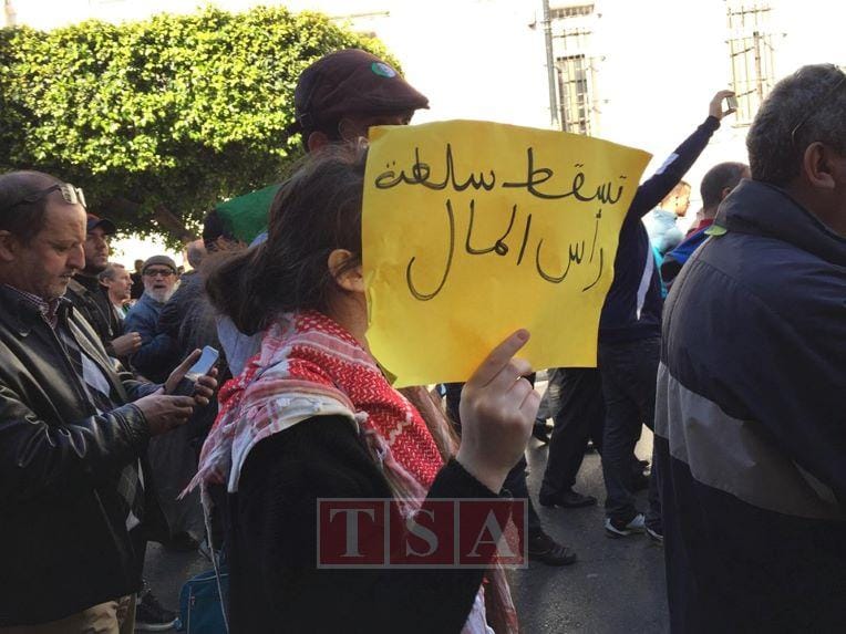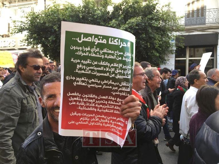 Après avoir entonné l’hymne national, les manifestants entament leur marche vers 10h45. Ils réitèrent leurs revendications et scandent les slogans habituels, hostiles au pouvoir et aux résultats de la dernière élection présidentielle : « Le peuple veut la chute du système » ou encore : « Ma votina ma adna rais » (on n’a pas voté et on n’a pas de président).