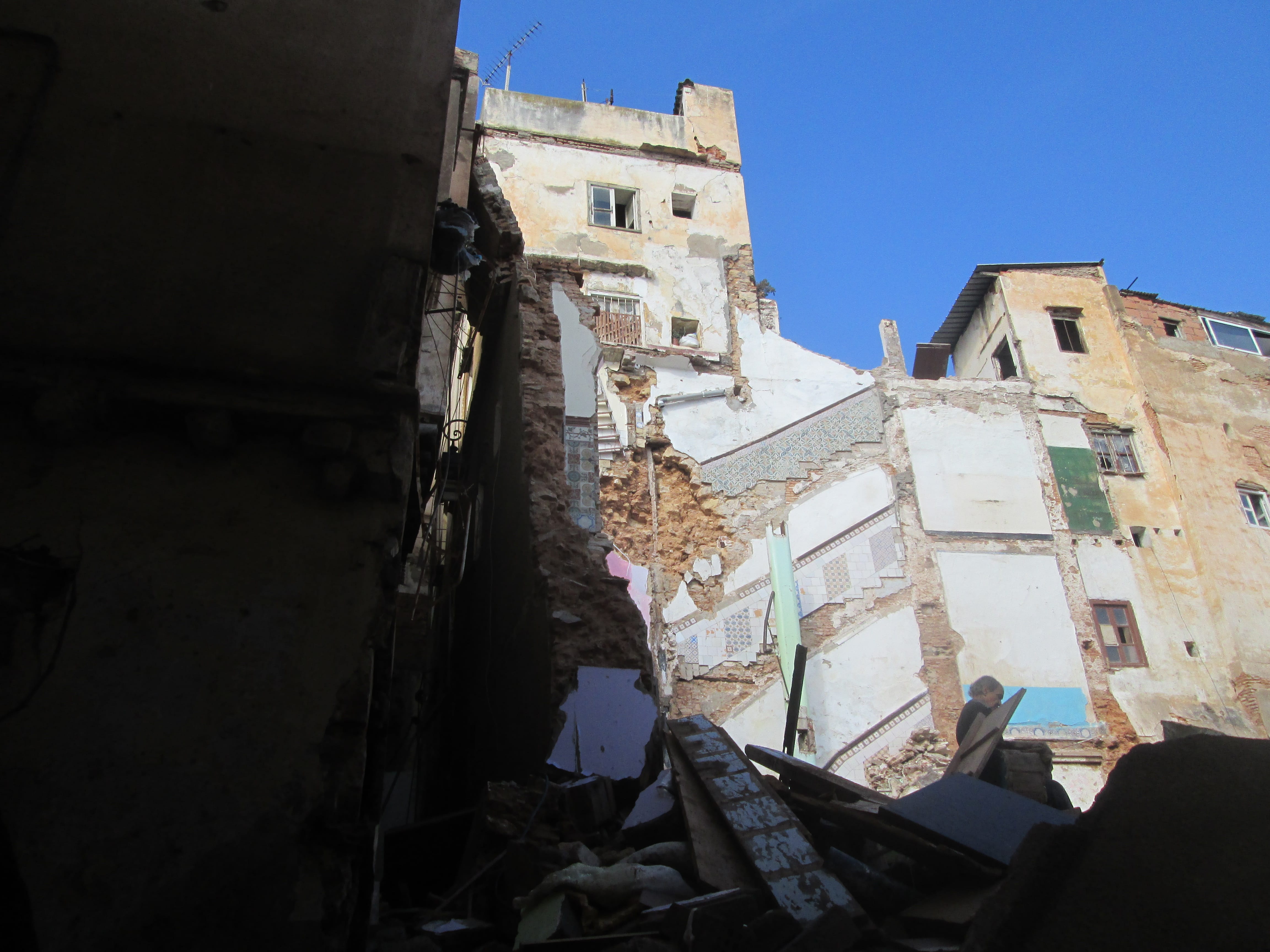 Au n°12 de la rue Boudries, c’est l’apocalypse. D’énormes blocs de pierres entravent l’entrée de cette vielle bâtisse qui ne tient plus qu’à un poil. Il faut escalader un monticule de pierres et de blocs pour pénétrer dans la skifa. D’énormes cales soutiennent les murs et les plafonds.