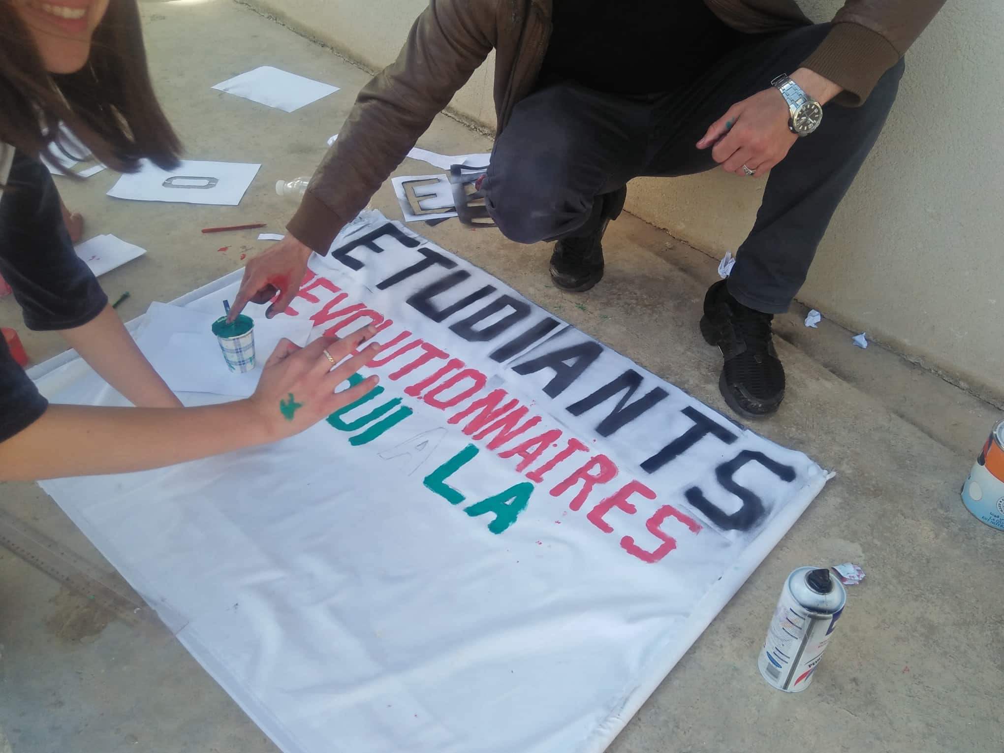 Dans un des ateliers organisés par les étudiants, des pancartes et banderoles sont confectionnées. Elles portent des slogans exprimant le rejet du système, des 4 B (Bensalah, Belaiz, Bedoui et Bouchareb), des revendications portant sur l’instauration de l’État de droit et d’autres dénonçant la répression des marches pacifiques.