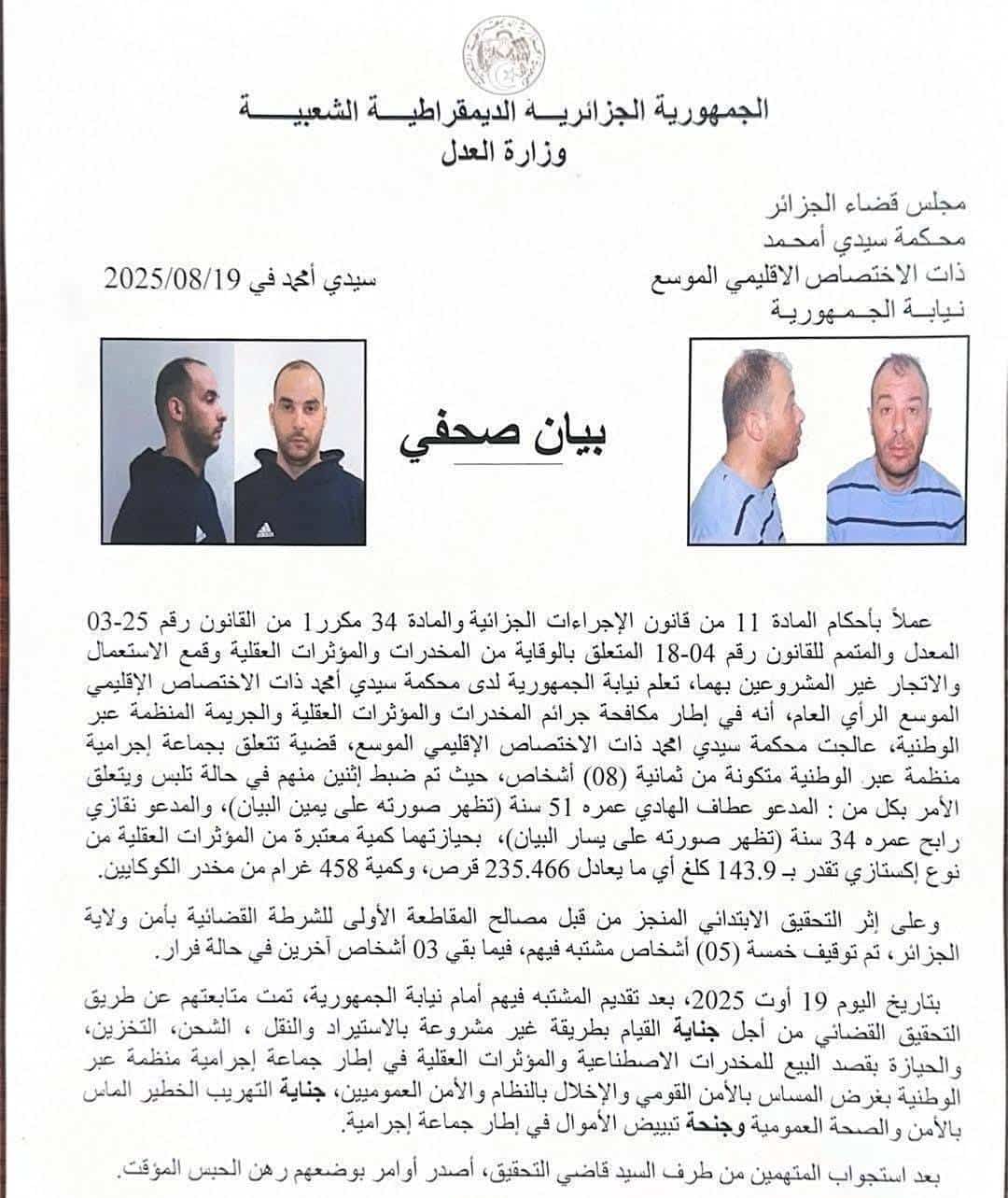 Le groupe criminel est composé de huit personnes, dont deux ont été arrêtées en « flagrant délit » de trafic de stupéfiants, indique le parquet. En plus de leurs photos, leur identité a été dévoilée : il s’agit de Ataf El Hadi, 51 ans, et Neguazzi Rabah (34 ans) qui ont été arrêtés en « possession d’une quantité considérable de comprimés psychotropes de type ecstasy, pesant 143.9 kg, soit l’équivalent de 235.466 comprimés, ainsi que 458 grammes de cocaïne », précise le parquet.