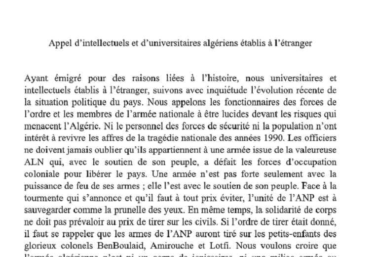 Nous voulons croire que l’armée algérienne n’est ni un corps de janissaires, ni une milice armée au service d’un régime impopulaire. Les officiers de l’armée sont les fiers descendants des maquisards de l’ALN et sont des soldats de la république prêts à défendre leur peuple. Entre Algériens, il n’y a pas d’ennemis que l’armée combattrait. Il y a seulement des divergences idéologiques et politiques au sein de la société qui devraient et pourraient être résolues par le débat libre et l’alternance électorale. Nous appelons nos frères officiers à être à la hauteur de l’éthique de l’honneur de l’ALN et à ne pas être l’instrument de répression des revendications légitimes des jeunes générations pour la construction de l’Etat de droit et de la démocratie.