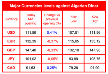 Ce jeudi 14 septembre, le dollar a établi un nouveau record historique, à 111,51 dinars dans les échanges interbancaires fixés par la Banque d’Algérie pour les opérations de commerce extérieur (pour l’allocation touristique particuliers, le taux -qui est affiché dans les agences bancaires- est supérieur).