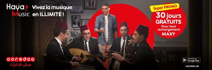 En effet, les clients Ooredoo souscripteurs aux recharges MAXY Hadra à partir de 1000 DA, MAXY Internet et Super MAXY pourront profiter d’un mois d’utilisation gratuite du service Haya! Music et auront ainsi l’opportunité d’accéder à toute la musique du monde gratuitement et directement sur leur mobile pendant 30 jours.