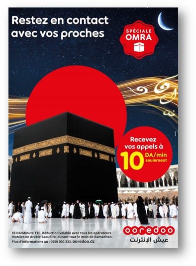 En effet, Ooredoo accompagne ses clients voyageant aux lieux Saints de l’Islam en leur permettant de recevoir des appels au tarif exceptionnel de 10 DA TTC/minute seulement et ce, durant tout le mois de Ramadhan.