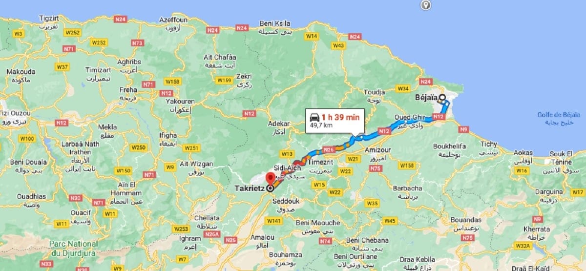L’autre axe routier qui permet aux habitants de Béjaia de se rendre à Alger et l’ouest du pays, est la RN12 qui passe par Azazga et Tizi-Ouzou. Cette route est fortement dégradée entre El Kseur et Azazga sur 65 km, ce qui rend la circulation difficile et dangereuse.