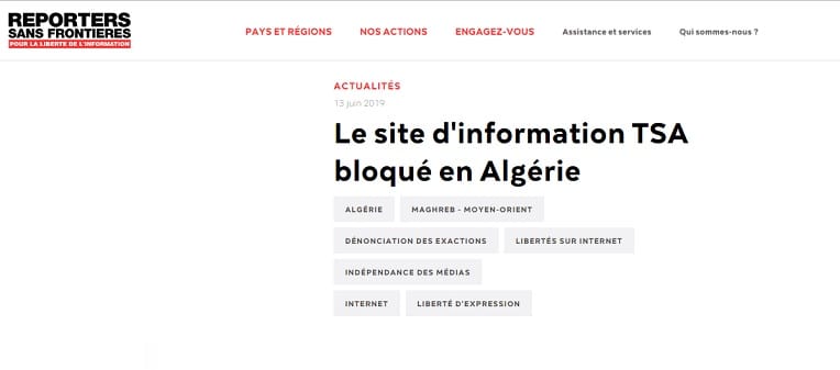 “Le fait que TSA soit bloqué sur le seul territoire algérien laisse à penser à une censure de nature politique vu son ton critique envers les autorités, déclare Souhaieb Khayati directeur du bureau Afrique du Nord de RSF. Nous appelons les responsables compétents à mettre tout en oeuvre pour que le site d’information soit à nouveau accessible pour les algériens.”