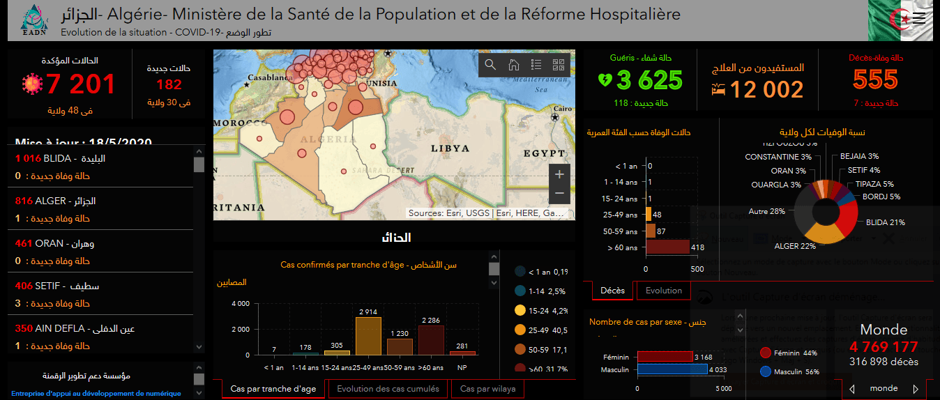 Par wilayas, Blida demeure la plus touchée en termes de contaminations avec 1016 cas et la deuxième en décès (116) après Alger (122). Ce lundi 18 mai, 14 nouveaux cas ont été diagnostiqués à Blida mais aucun nouveau décès. Alger compte 816 cas (dont 16 nouveaux) et 122 décès, suivie d’Oran (461), Sétif (406) et Aïn Defla (350). La plus forte progression de la journée (17 cas diagnostiqués) a été enregistrée à Béchar qui compte désormais 119 malades.