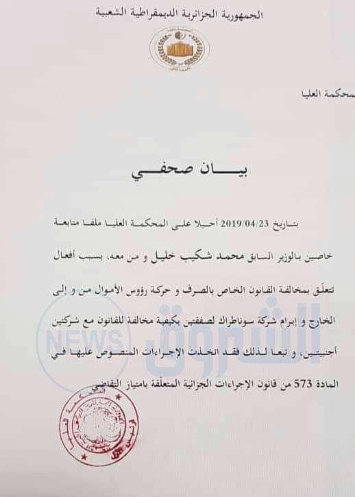Il est poursuivi par la Cour suprême pour « des actes liés à des infractions à la législation sur le change et les transferts de capitaux » et la conclusion par Sonatrach « de deux contrats de façon illégale avec deux sociétés étrangères », selon un communiqué de la Cour suprême.