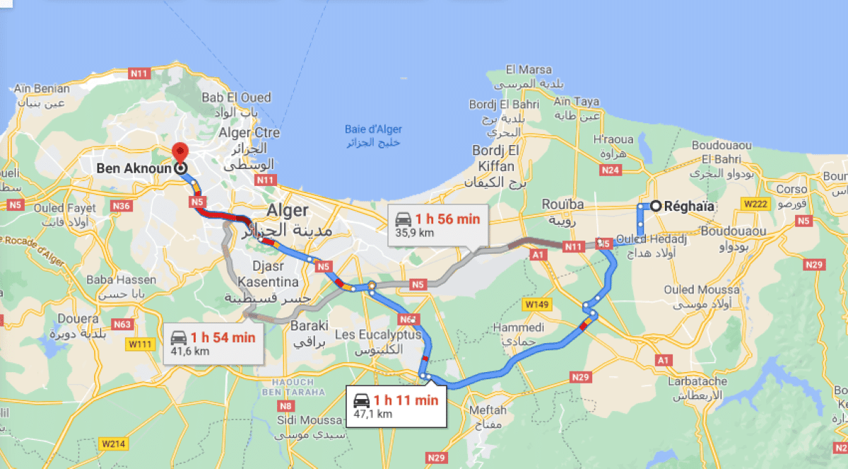 Sur Googles Maps, il faut 1 h 30 pour faire ce trajet, via l’autoroute est-ouest (A1). Pour le trajet Rouiba –Alger (30 km), il faut un peu plus (1 h 40 mn).
