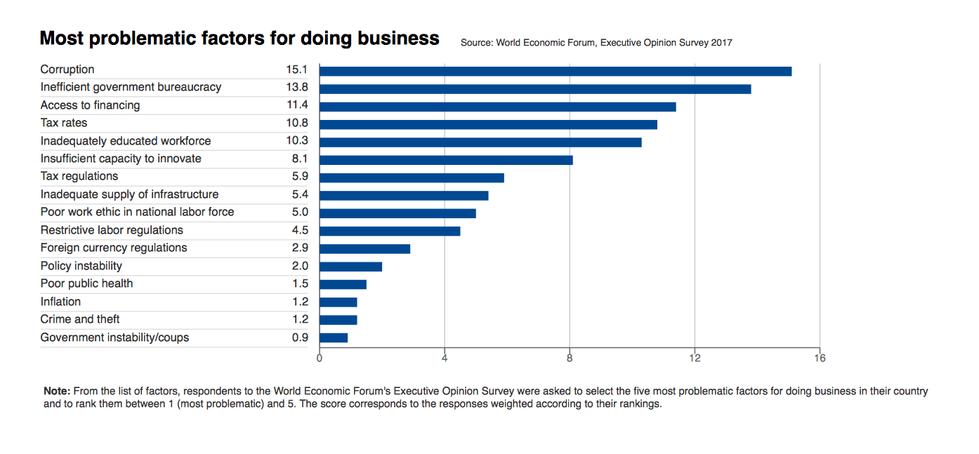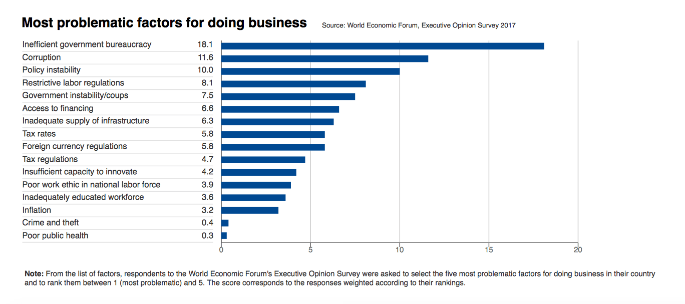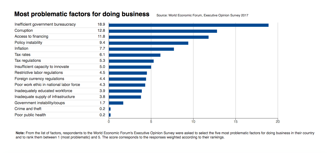 Le Forum économique mondial note, cette année encore, les mêmes facteurs qui empêchent à l’Algérie de fournir un cadre propice au business : une bureaucratie gouvernementale inefficace, la corruption et l’accès au financement. Ainsi, il faut noter qu’en matière d’efficience du marché du travail, l’Algérie se classe 133e sur 137 pays évalués et 125e pour le développement de son marché financier.