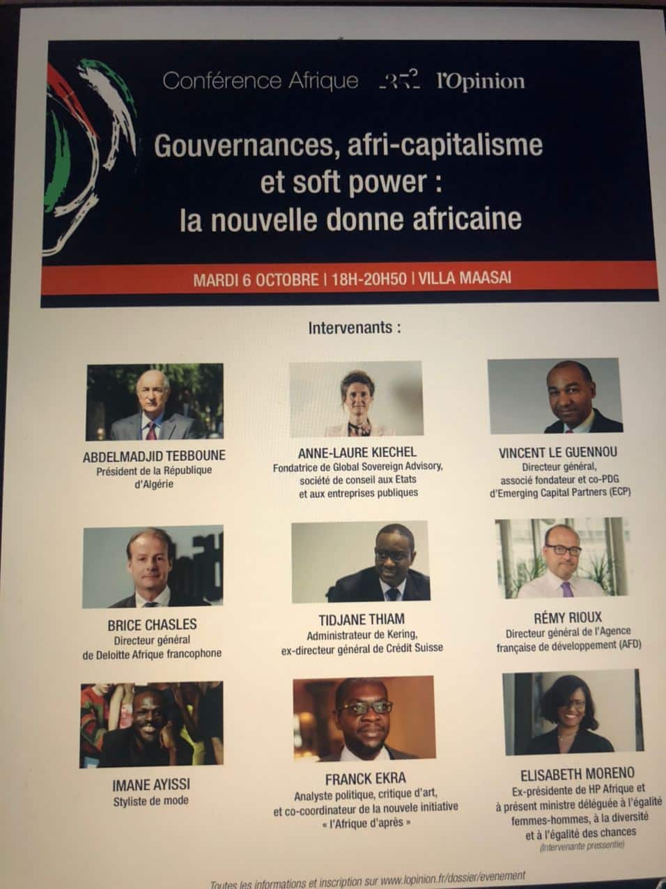 Cette rencontre, animée par des experts, a pour thème : « Gouvernances, afri-capitalisme et soft power : la nouvelle donne africaine ». Son but : « analyser et décrypter l’évolution du continent autour de trois dynamiques : la montée en puissance de nouvelles citoyennetés et formes de gouvernance ; l’émergence d’un afri-capitalisme spécifique ; l’installation progressive du soft power africain », précise L’Opinion. Parmi les participants à cette conférence figurent Rémy Rioux, directeur général de l’Agence française de développement (AFD) et Tidjane Thiam, administrateur de Kering, ex-directeur général de Crédit Suisse.