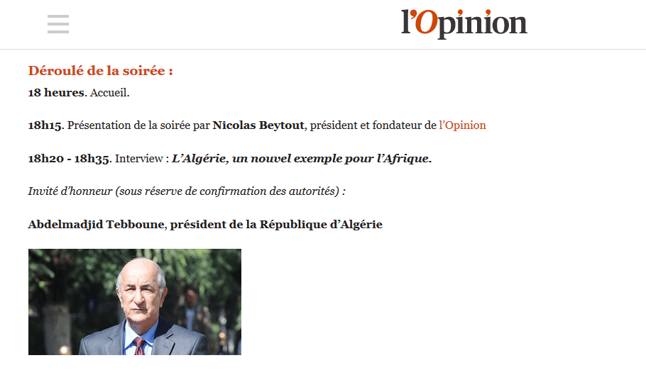 La participation de Tebboune en tant qu’ « invité d’honneur » a été annoncée hier vendredi 4 septembre par le quotidien français L’Opinion et l’agence de communication spécialisée sur l’Afrique 35°Nord, organisateurs de cet évènement.