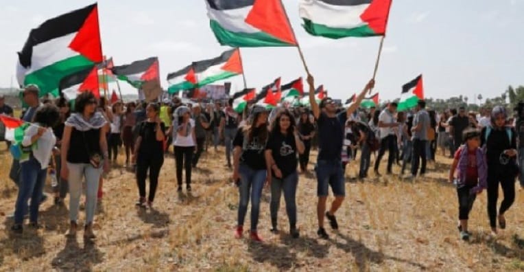 Brandissant des drapeaux palestiniens, les manifestants ont réclamé le « droit au retour » des réfugiés dont les familles ont fui ou ont été expulsées de leurs maisons en 1948.