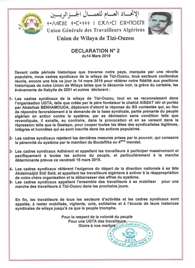 17h07. UGTA : l’Union de wilaya de Tizi Ouzou rejette le prolongement du mandat de Bouteflika, et réclame le départ de Sidi Said, et appelle les travailleurs à se mobiliser pour une marche dans les prochains jours.
