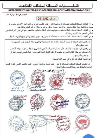 21h05. Douze syndicats autonomes appellent dans un communiqué commun à participer en force aux marches de ce vendredi 15 mars contre la prorogation du mandat de Bouteflika.