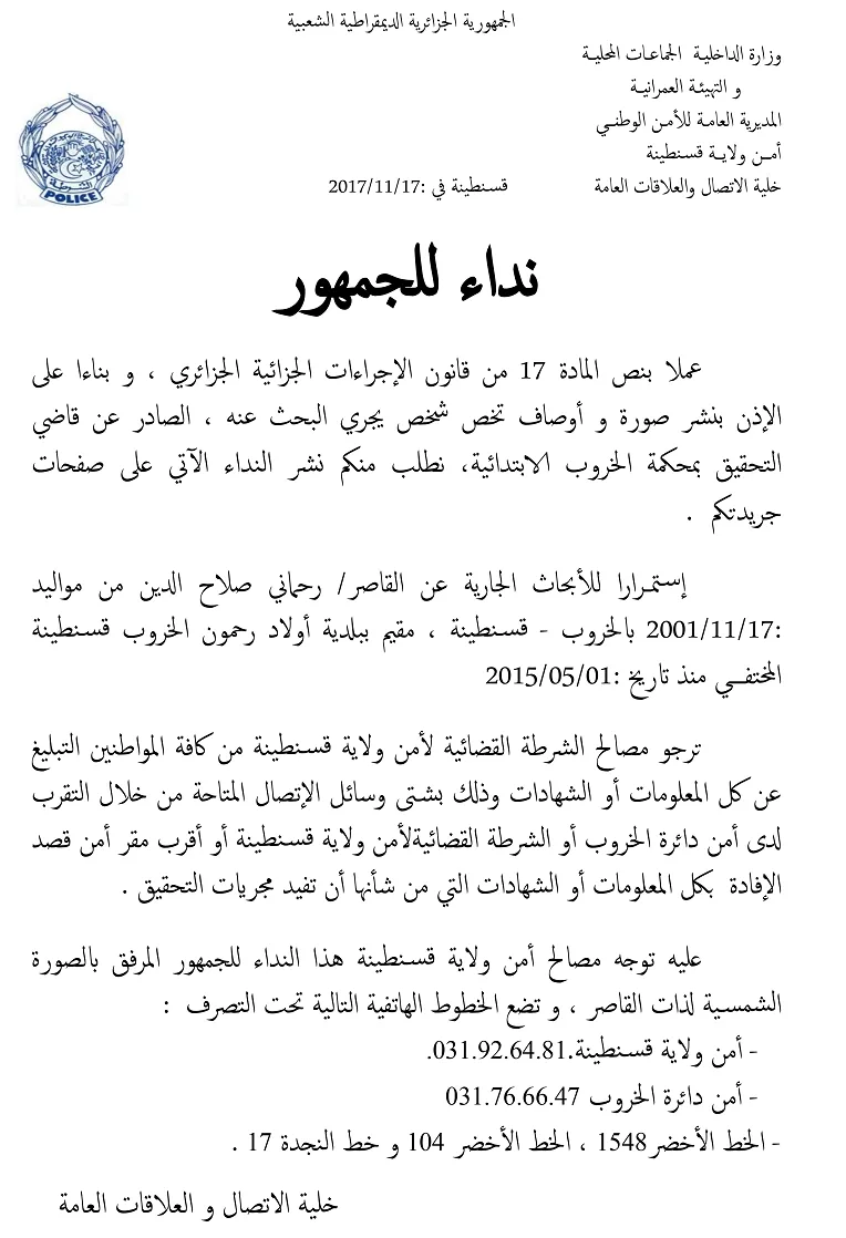 La police met aussi à la disposition des citoyens détenant des informations utiles aux recherches les numéros de téléphone de la sûreté de wilaya de Constantine : 031.92.64.81 ; de la sûreté de la Daïra d’El Khroub : 031.76.66.47 et les numéros verts : 15 48, 104 et 17.
