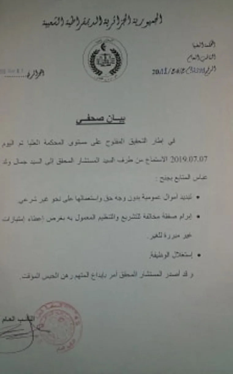 Djamel Ould Abbes a été placé, ce dimanche 7 juillet, en détention provisoire par le conseilleur enquêteur de la Cour suprême, rapporte l’ENTV.