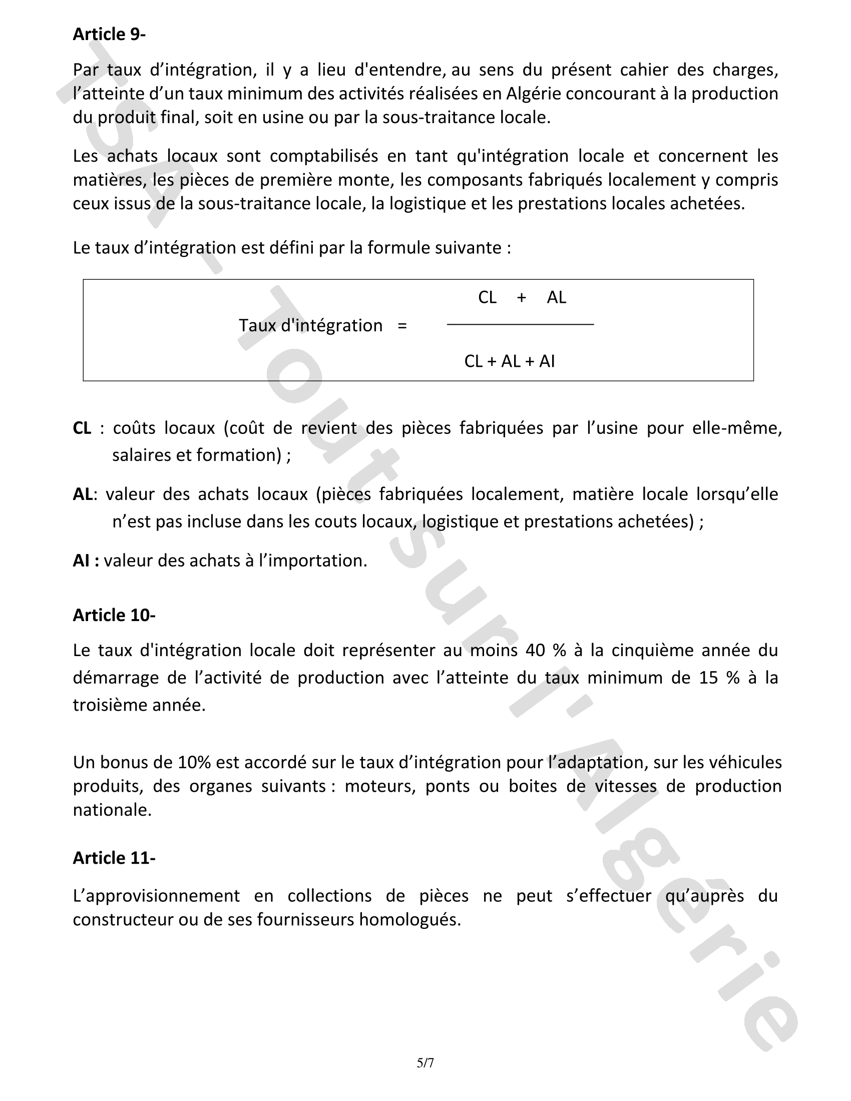 Les articles comportent des généralités, d’autres sont flous. Par exemple, l’article 9, qui définit le taux d’intégration et la méthode de son calcul. « Par taux d’intégration, il y a lieu d’entendre, au sens du présent cahier des charges, l’atteinte d’un taux minimum des activités réalisées en Algérie concourant à la production du produit final, soit en usine ou par la sous-traitance locale », énonce l’article 9 du cahier des charges. Ce taux d’intégration est la somme des coûts locaux (CL) et de la valeur des achats locaux (AL) divisé par la somme des coûts locaux (CL), des achats locaux (AL) et de la valeur des achats à l’importation (AI).