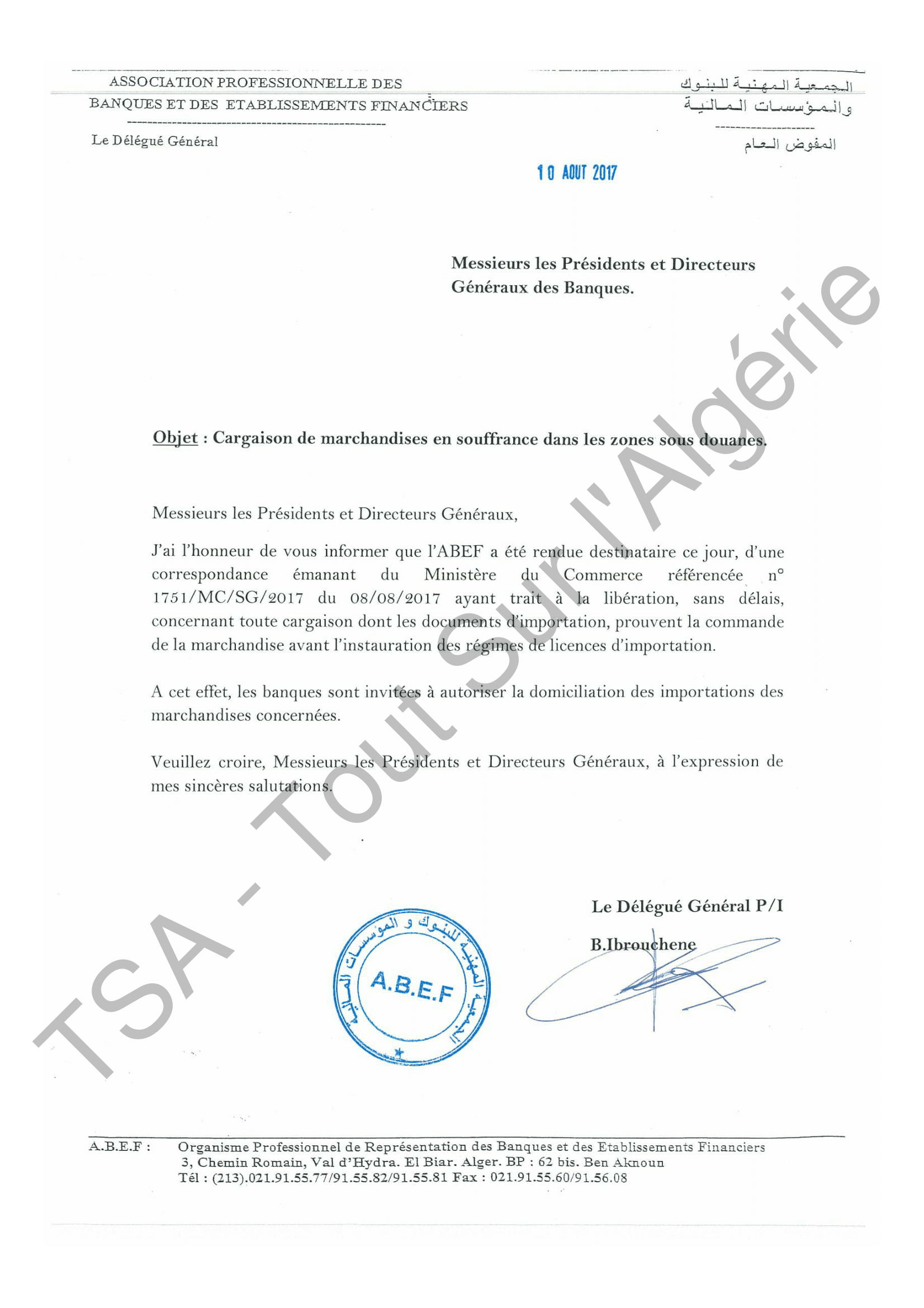 « J’ai l’honneur de vous informer que l’Abef a été destinataire d’une correspondance émanant du ministère du Commerce ayant trait à la libération, sans délais, concernant toute cargaison, dont les documents d’importation, prouvent la commande de la marchandise avant l’instauration du régime de licences d’importation« , précise l’Abef dans sa note adressée aux PDG des banques, dont nous détenons une copie.