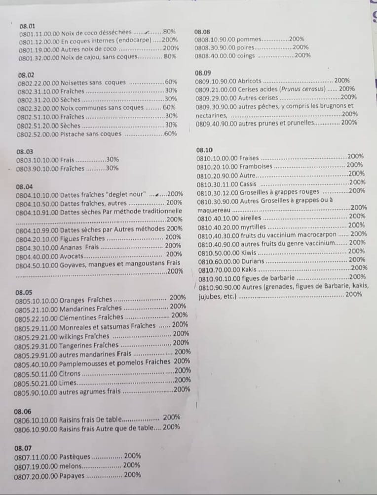 La liste des fruits soumis au DAPS qui circule actuellement et dont TSA s’est procuré une copie prévoit ainsi des taxes d’importation à un taux de 200% pour des fruits frais tels que les dattes, figues, ananas, avocats, oranges, mandarines, pommes, poires, citrons, kiwis, fraises, pastèques, framboises, figues de barbarie, abricots, cerises et autres melons.
