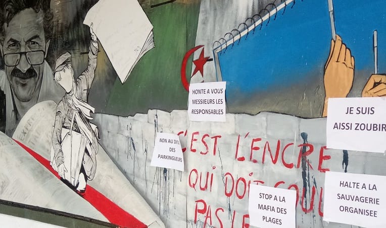 Place Said Mekbel de la ville de Bejaia, inscriptions dénonçant la violence collées au mur par la population qui a dénoncé le diktat des mafias à Bejaia après l’agression meurtrière à Souk Lethnine d’un estivant originaire de Oued Souf, ©TSA.