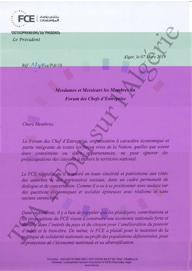 « S’agissant des manifestations populaires pacifiques et citoyennes de nos concitoyens pour revendiquer un lendemain meilleur et sûr, le Forum des Chefs d’Entreprise croit fermement au principe de la revendication pacifique et légitime au service de la nation », écrit Haddad dans une lettre adressée aux membres du FCE, dont TSA a obtenu en exclusivité une copie.