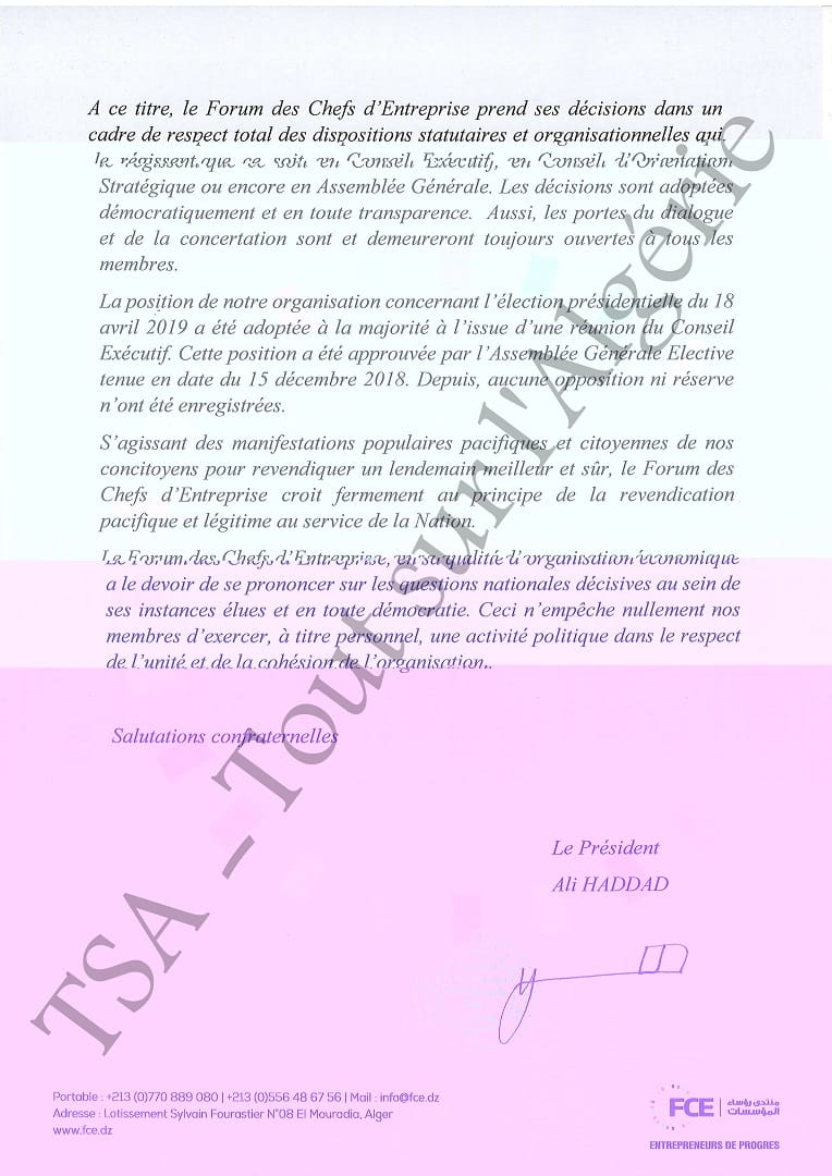 « Le Forum des Chefs d’Entreprise, en sa qualité d’organisation économique a le devoir de se prononcer sur les questions nationales décisives au sein de ses instances élues et en toute démocratie. Ceci n’empêche nullement nos membres d’exercer, à titre personnel une activité politique dans le respect de l’unité et de la cohésion de l’organisation », écrit par ailleurs Ali Haddad.