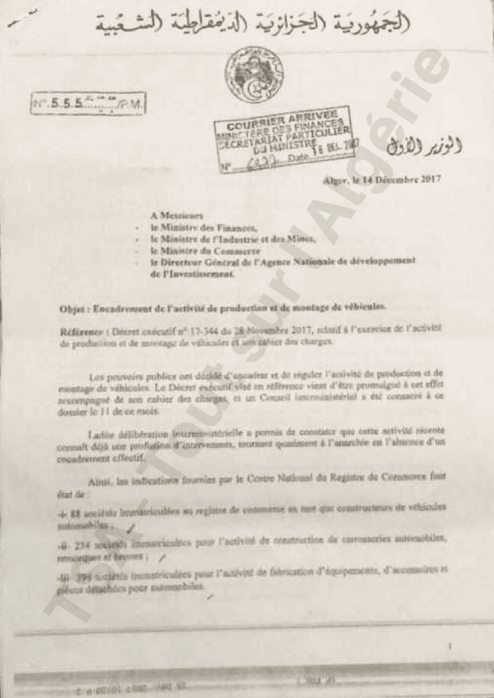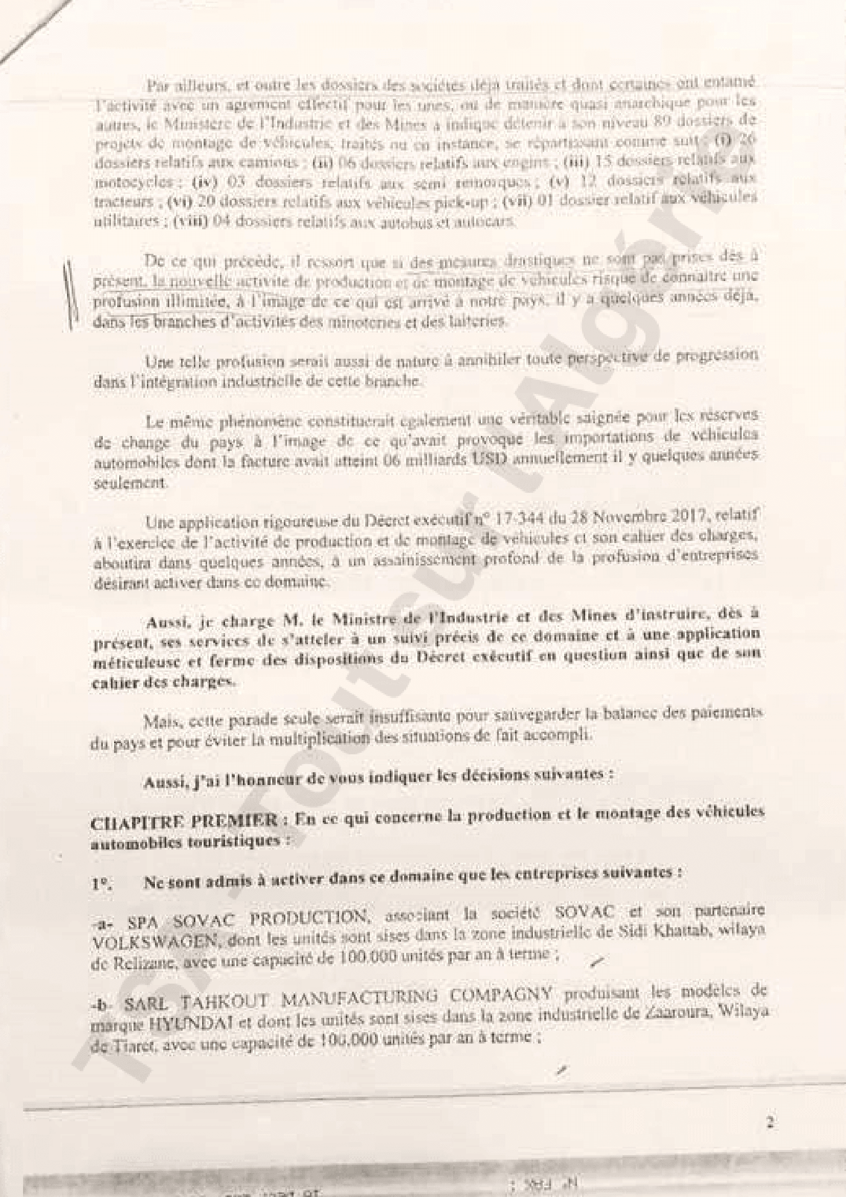 Portant l’objet « encadrement de l’activité de production et de montage de véhicules en Algérie », la note précise : « Les pouvoirs publics ont décidé d’encadrer et de réguler l’activité de production et de montage de véhicules. Le décret exécutif visé en référence vient d’être promulgué à cet effet et accompagné de son cahier des charges, et un conseil interministériel a été consacré à ce dossier le 11 de ce mois ».