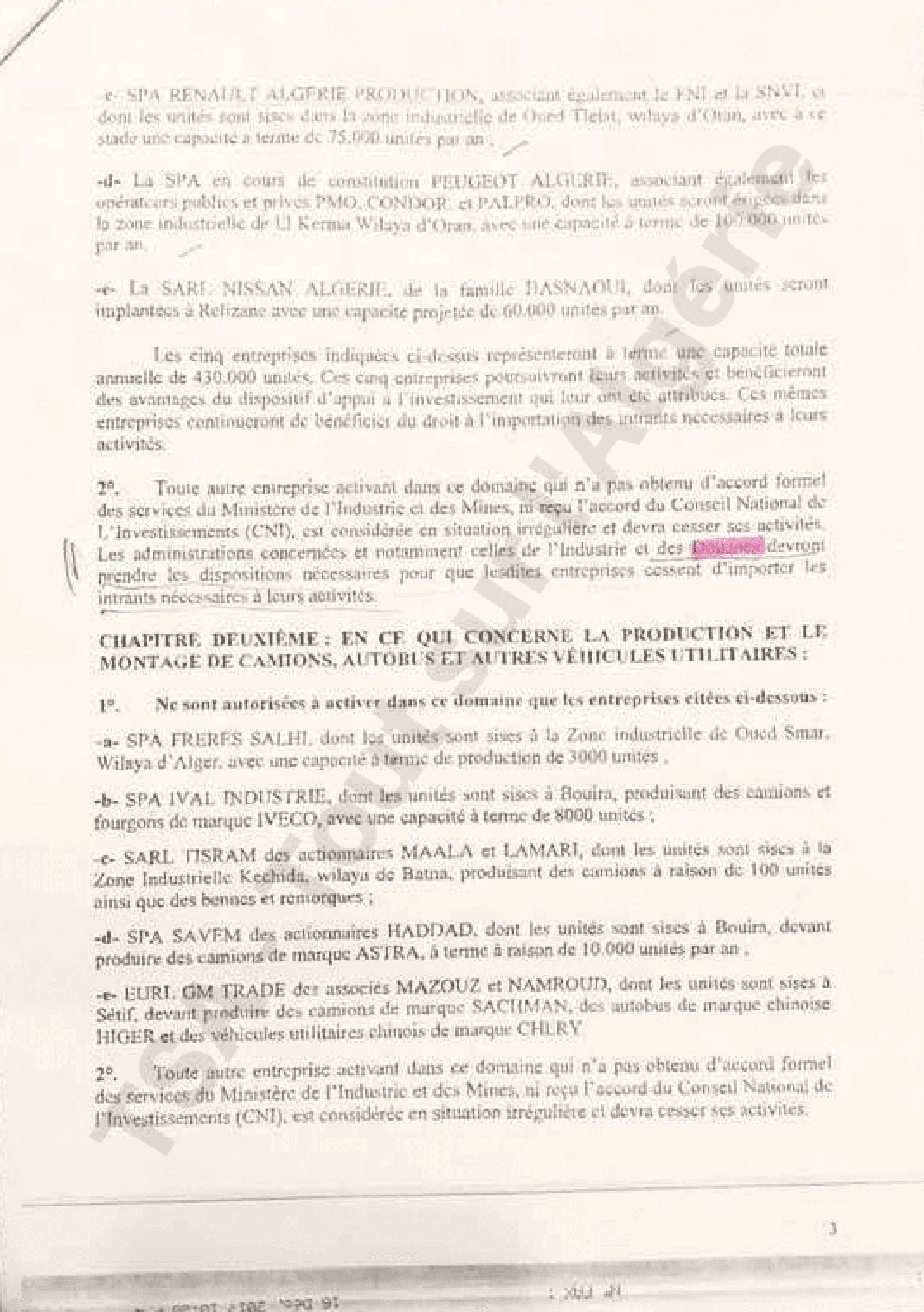 Pour les camions, autobus et véhicules utilitaires : SAP Frères Salhi, SPA Ival, SARL Tirsam, SPA Saven « des actionnaires Haddad » qui va produire les véhicules Astra et l’EURL GM Trade des associés Mazouz et Namroud, détaille le document.
