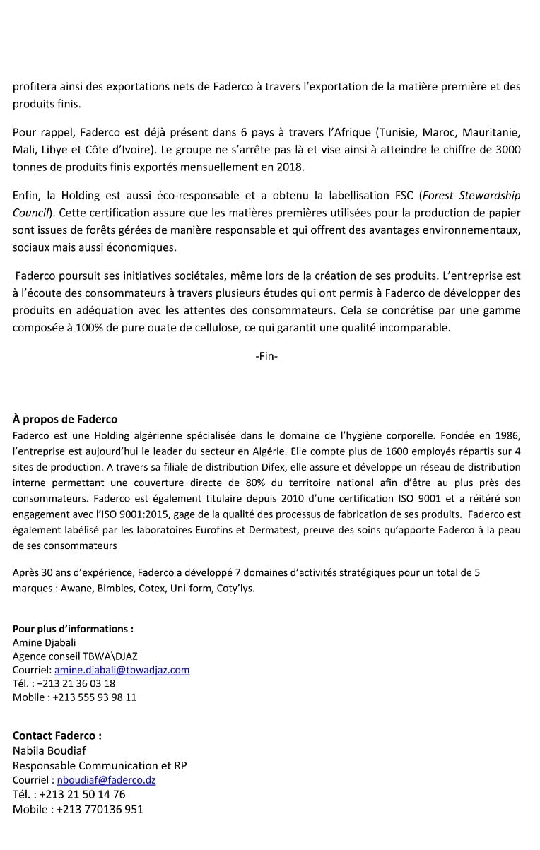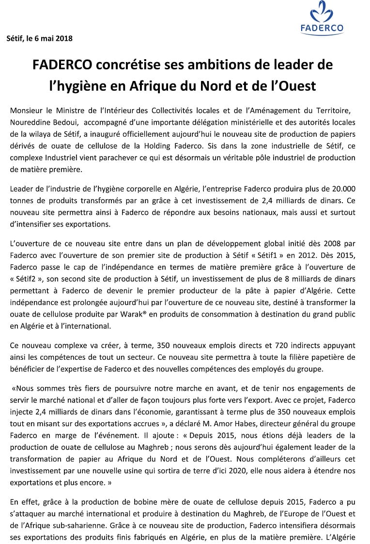 FADERCO concrétise ses ambitions de leader de l’hygiène en Afrique du Nord et de l’Ouest