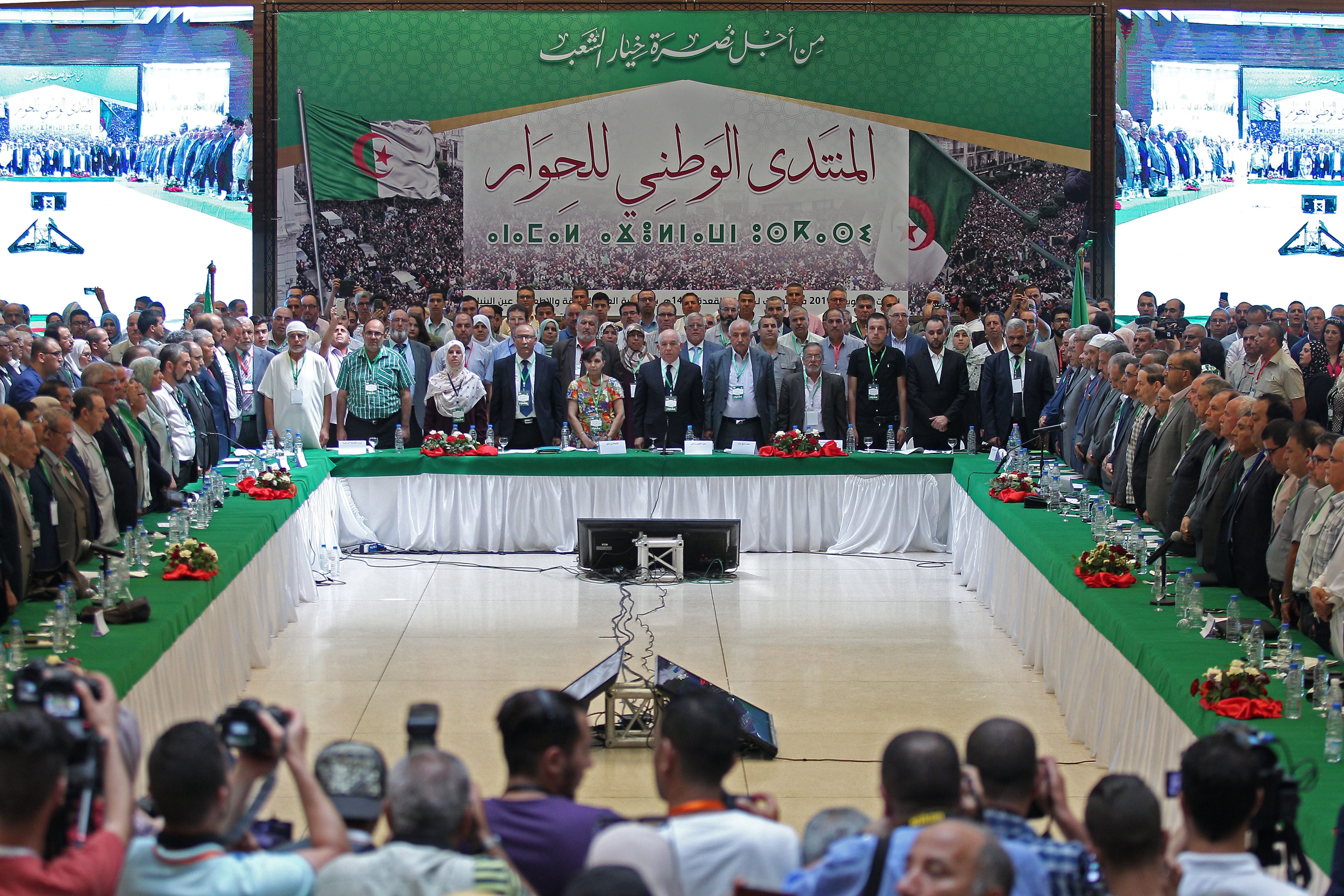 Benflis, président de Talai al Houriyat, ancien chef de gouvernement et deux fois candidat malheureux à la présidentielle, est accueilli en guest star par les journalistes. Une première mouture de la plateforme qui sera soumise à débat est distribuée. Les principes, les objectifs et le cadre du dialogue sont énoncés, l’exclusion des partisans de l’ancien président réitérée et des mesures d’apaisement réclamées.