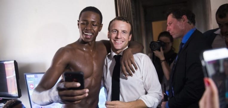 Le cliché a été pris à l’occasion de la visite du président sur l’île de Saint-Martin, dans les Antilles françaises. Deux jeunes Noirs entourent Emmanuel Macron, dont l’un, torse nu, fait un doigt d’honneur.