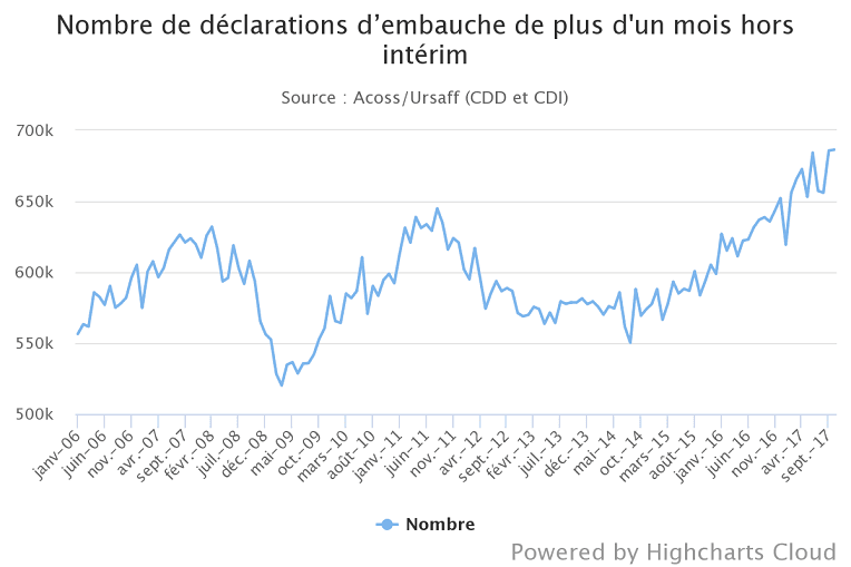 « Le niveau élevé du mois dernier se maintient (686.000). Sur trois mois, les déclarations d’embauche de plus de un mois progressent de 4,4 %. Sur un an, elles augmentent de 8,0 %. »