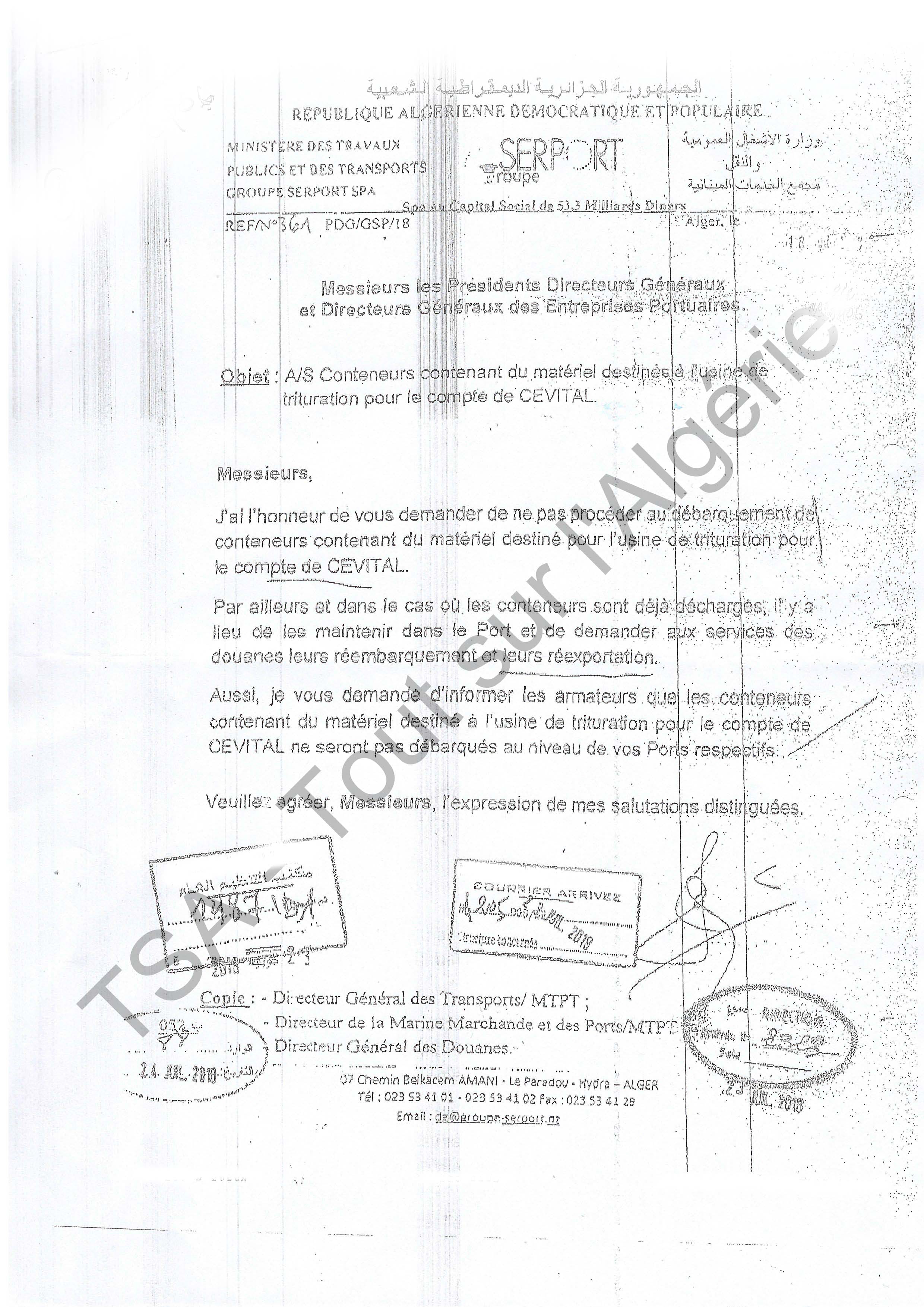 Le Groupe Services Portuaires (Serport) a demandé à tous les Présidents directeurs généraux et directeurs généraux des ports algériens de refuser le débarquement de conteneurs contenant le matériel industriel de Cevital destiné à son projet d’usine de trituration de graines oléagineuses à Bejaia, dans une instruction datée du 18 juillet que TSA a pu se procurer.