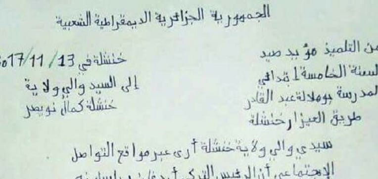 Une lettre qui aurait été écrite par un élève en cinquième année dans une école primaire de Khenchela fait le buzz sur les réseaux sociaux. Dans cette lettre adressée au wali, l’enfant évoque l’absence de chauffage dans son école.