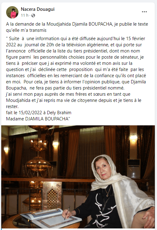 « Suite à une information qui a été diffusée aujourd’hui le 15 février 2022 au journal de 20h de la télévision algérienne, et qui porte sur l’annonce officielle de la liste du tiers présidentiel, dont mon nom figure parmi les personnalités choisies pour le poste de sénateur, je tiens à préciser que (sic) ma volonté et mon avis sur la question », lit-on dans une déclaration publiée sur Facebook par Nacera Douagui, au nom de la moudjahida.