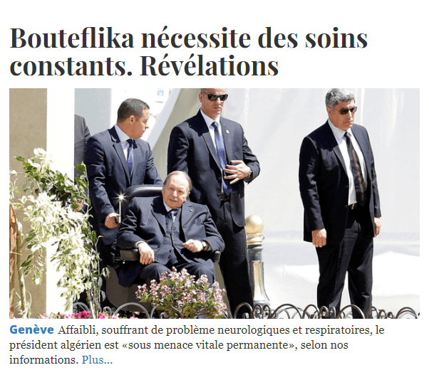 « Il ne souffre d’aucun mal mortel à court terme, mais c’est un vieux monsieur qui peine à se remettre des conséquences de son attaque cérébrale de 2013. Car c’est bien en raison des compétences des HUG en matière de neurologie qu’Abdelaziz Bouteflika y séjourne depuis le 24 février », affirme le journal suisse.