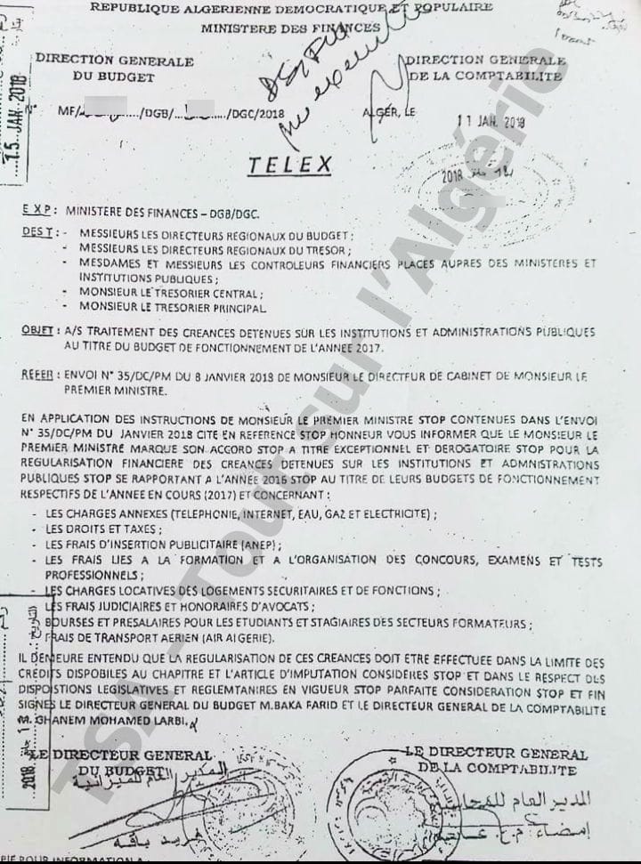 La note du ministère des Finances adressée aux directeurs régionaux du budget, directeurs régionaux du trésor, contrôleurs financiers placés auprès des ministères et institutions publiques, trésorier central et trésorier principal pour le « traitement des créances détenues sur les institutions et administrations publiques au titre du budget de fonctionnement de l’année 2017 ».