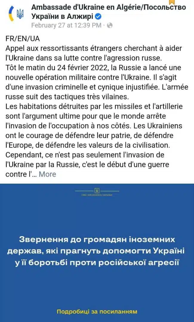 Alors que le conflit entre Ukrainiens et Russes entame sa deuxième semaine ce vendredi, un étrange appel à rejoindre l’armée ukrainienne a été publié, jeudi 3 mars, par l’ambassade d’Ukraine à Alger sur son compte Facebook.