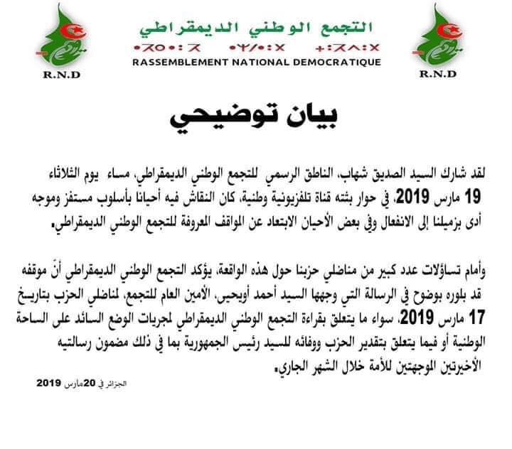 Le RND s’est clairement démarqué des propos tenus par son porte-parole, Seddik Chiheb, tenus mardi 19 mars à El Bilad TV.