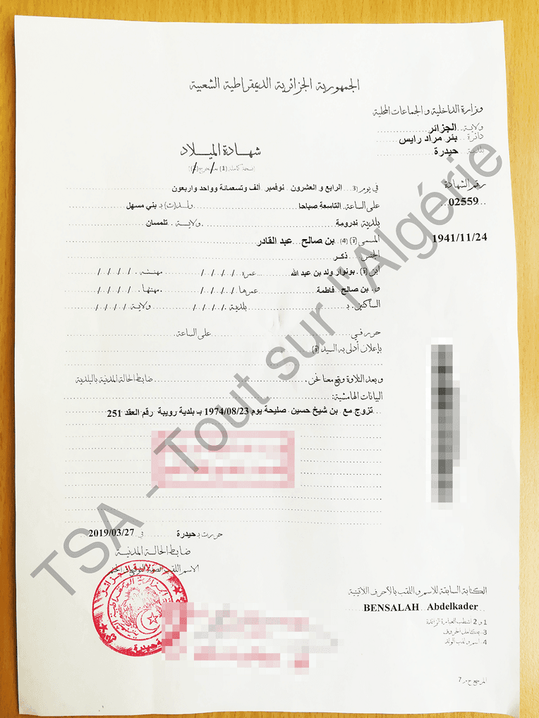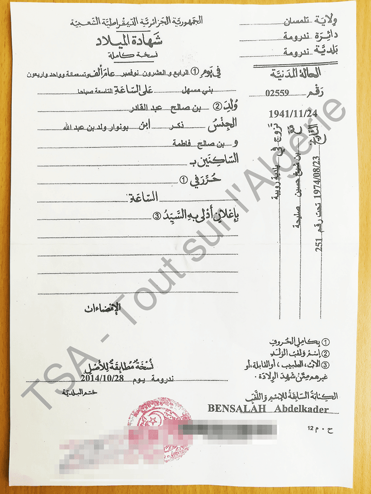 TSA a aussi pu se procurer des documents d’état civil (extraits de naissance) conformes à la biographie qui figure sur le site du Sénat. On a aussi pu avoir l’extrait de naissance du père de M. Bensalah (Bensalah Bounouar, né en 1906 à Beni Messahel) et de son grand-père (Benabdallah benbounouar ould Salah, présumé né en 1854 dans la commune de Felaoucène, Tlemcen).