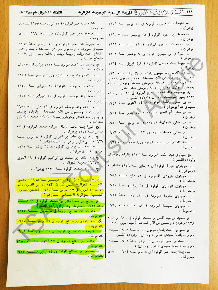 TSA a examiné le décret partagé sur les réseaux sociaux et il s’est avéré qu’il concerne une autre personne. Ce n’est même pas un homonyme. Sur le décret datant du 30 décembre 1965 et publié dans le journal officiel N° 9 du 1er février 1966 (version arabe) il est indiqué qu’un certain Salah ben Abdelkader a obtenu la nationalité algérienne ainsi que ses enfants mineurs : Mamette bent Salah, Abdelkader ben Salah, Fatiha bent Salah, Hachim ben Salah et Mustapha ben Salah.