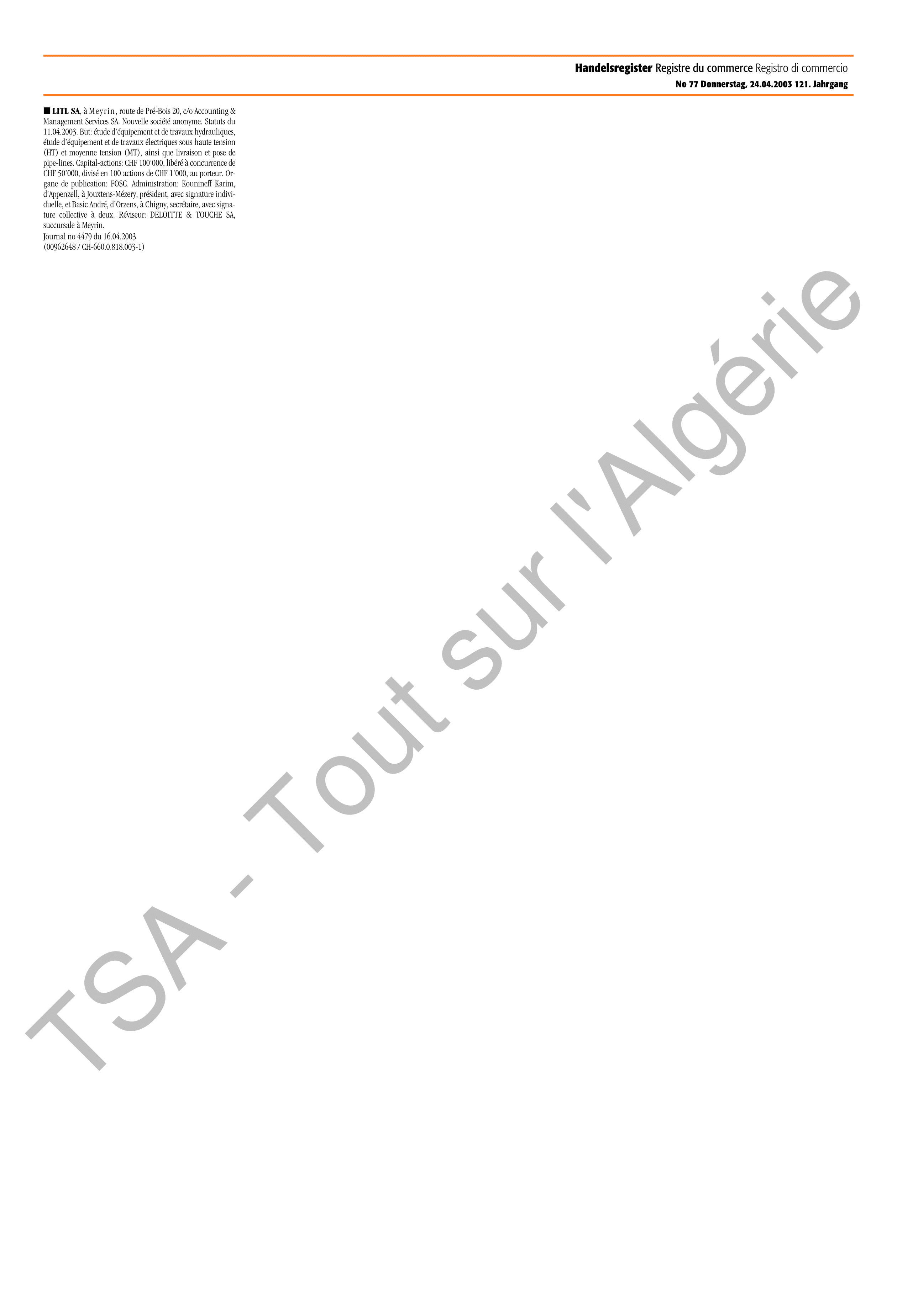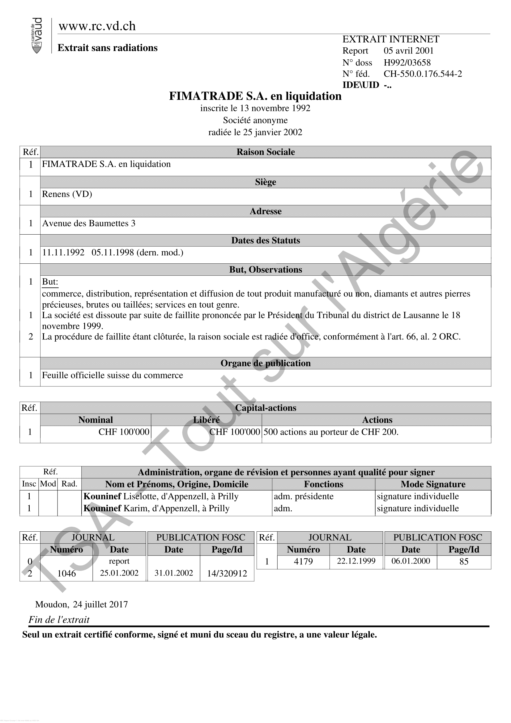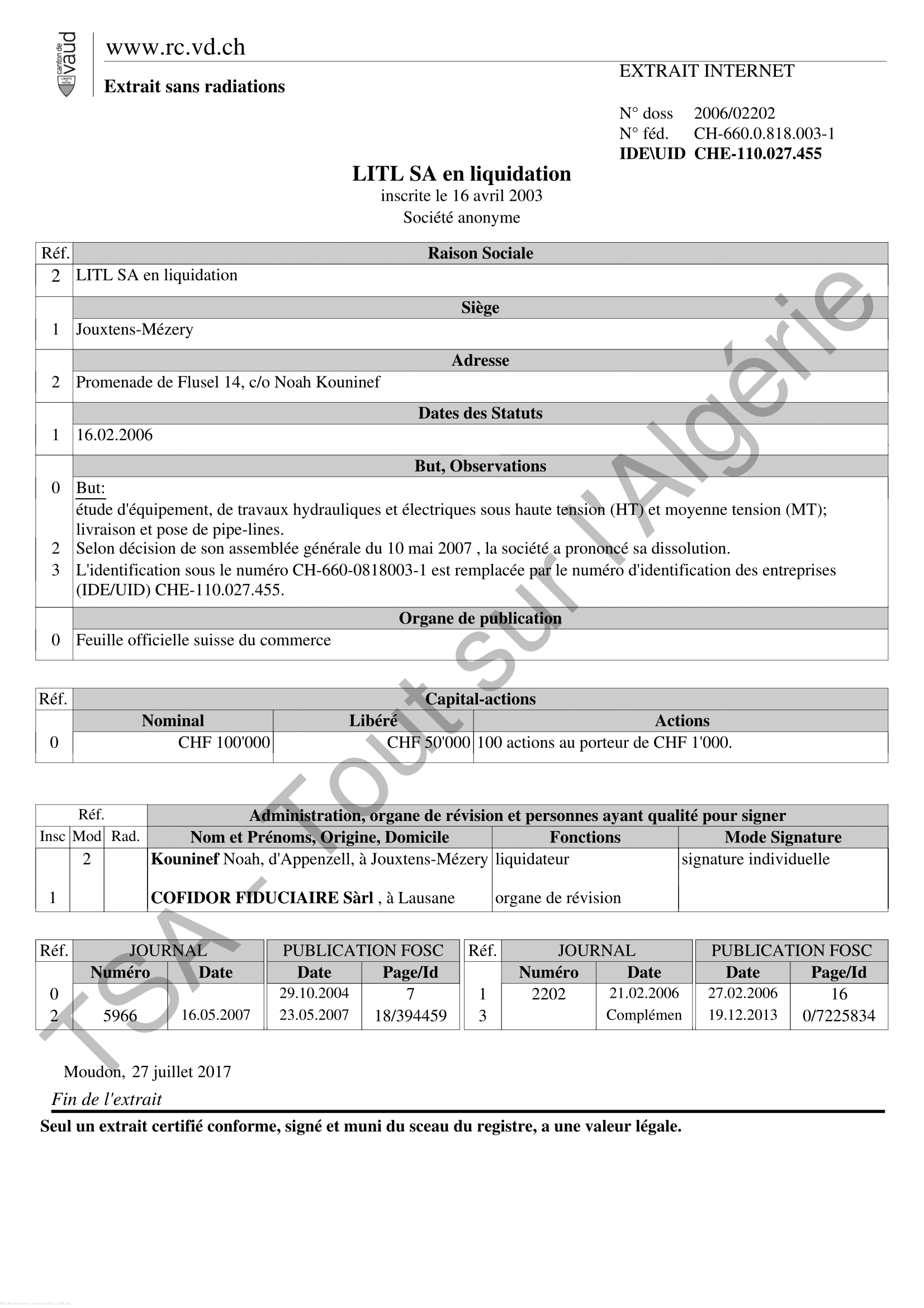 Ainsi, ces derniers auraient pris l’habitude de monter des entreprises à la durée de vie très limitée dans des domaines aussi variés que l’étude d’équipement, de travaux hydrauliques et électriques sous haute et moyenne tension, la livraison et la pose de pipe-lines avec LITL SA (inscrite en 2003 au registre des sociétés suisse et dissoute en 2007), le traitement de diamants et autres pierres précieuses brutes avec FIMATRADE S.A. (inscrite en 1992, dissoute en 1999), l’édition de magazines et l’organisation de voyages de vacances et de loisirs avec Bol d’Air SA (enregistrée en 1990 au registre des commerces, radiée en 2008).