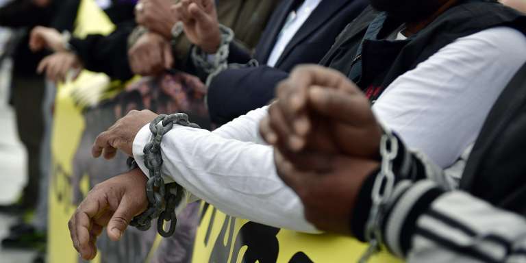 Demonstrators and migrants with their hands chained, take part in a march towards the offices of the European Union on December 2, 2017 in central Athens, protesting against the slavery of migrants in Libya and against the deals between the European Union (EU) and Turkey and between EU and Libya. / AFP PHOTO / LOUISA GOULIAMAKI (cachée)