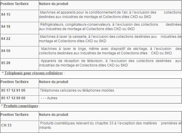 Pour les appareils électroménagers, sont exclus de ces contingents les produits destinés aux industries de montage et les produits CKD, tandis que pour les produits cosmétiques, sont exclues les matières premières et intrants.