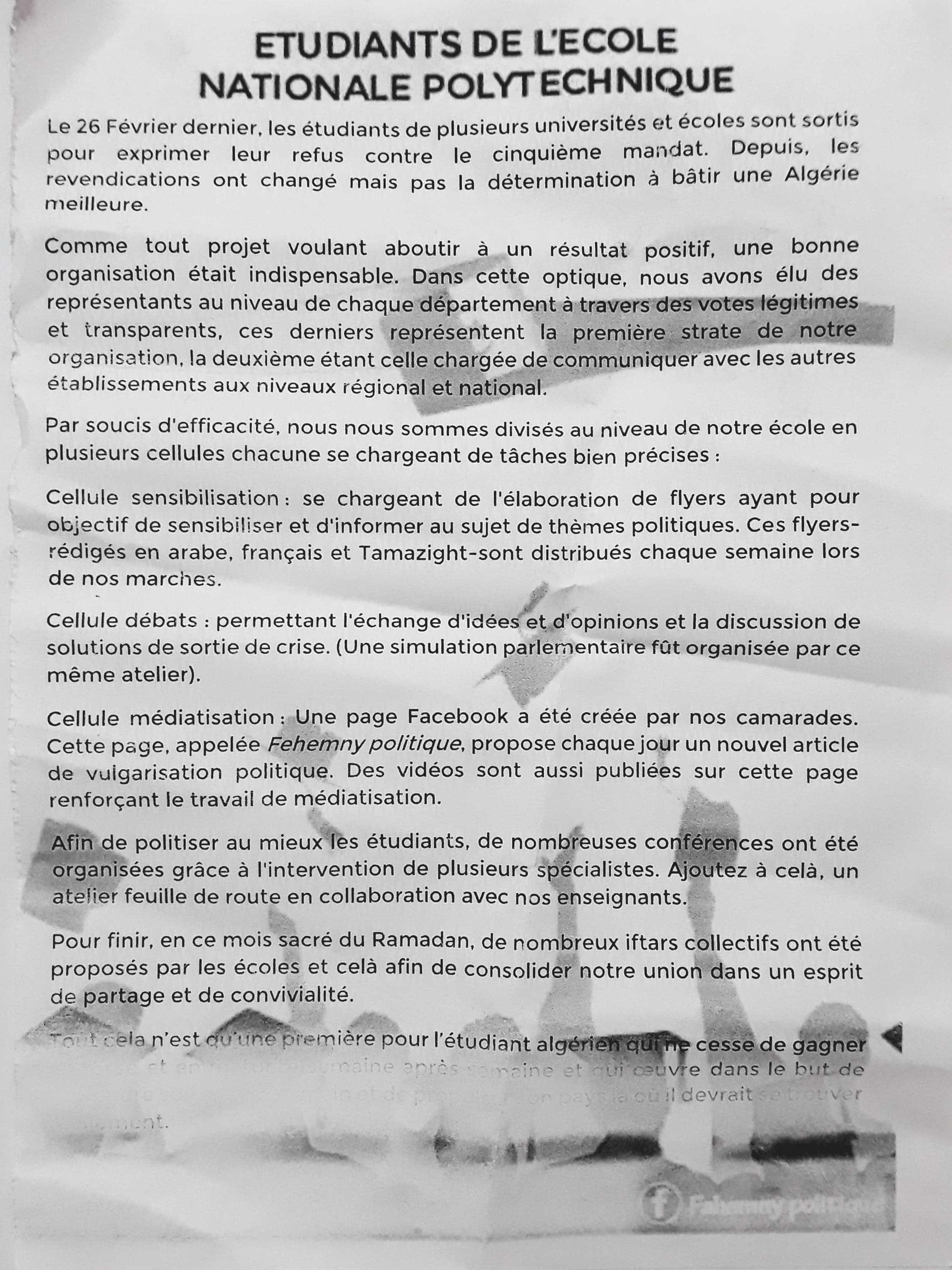 À Alger, lors de la marche de ce dimanche 19 mai, des tracts ont été distribués aux manifestants par des étudiants de l’École nationale polytechnique (ENP). Dans ce document, ces derniers détaillent la façon dont ils s’organisent pour faire valoir leurs revendications en marge du mouvement populaire amorcé le 22 février dernier.