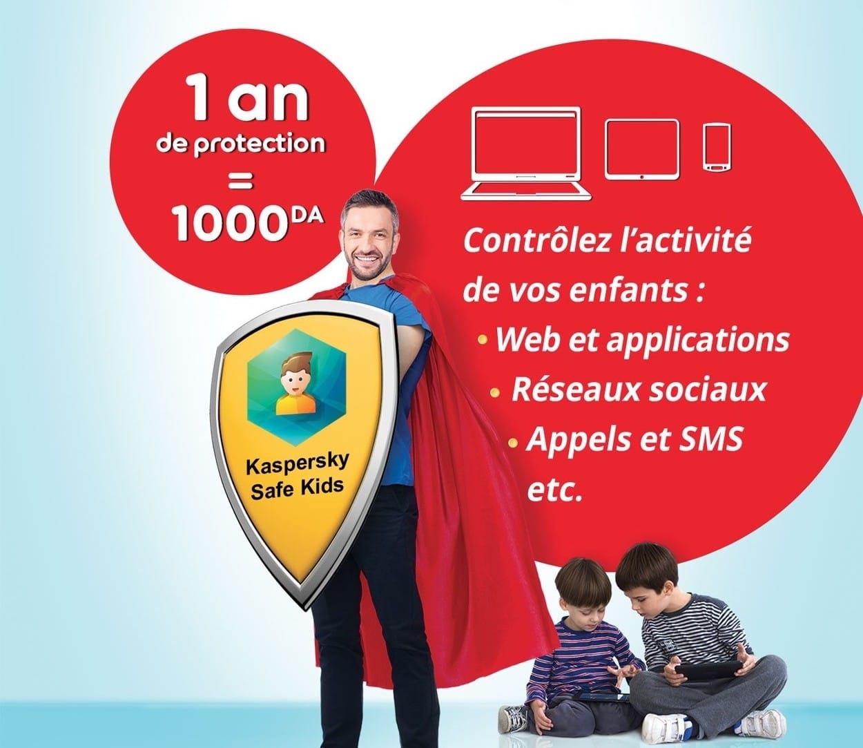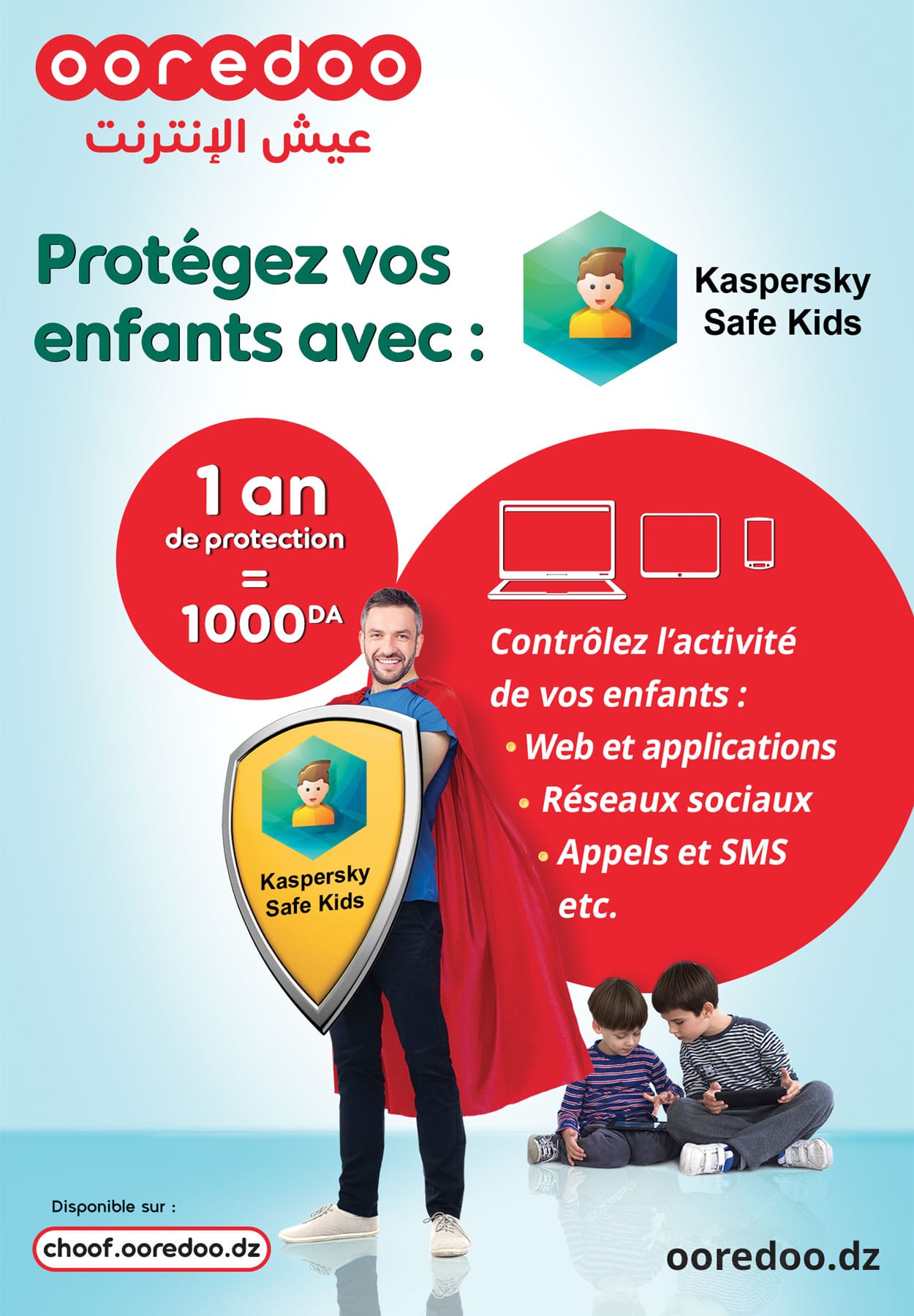 Pour 1000 DA seulement par an, cette nouvelle solution révolutionnaire dans le marché digital en Algérie, disponible uniquement chez Ooredoo, permet aux parents de gérer, en toute quiétude, la vie numérique de leurs enfants et bénéficier d’un outil de gestion de toutes leurs activités sur Internet, à savoir :
